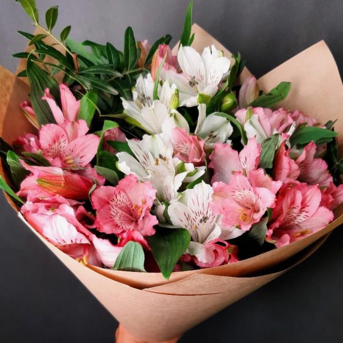 Альстромерия Микс Европа – 9 шт.Крафт упаковка – 3 шт.Лента атласная – 1 шт.зелень декоративная – 3 шт.