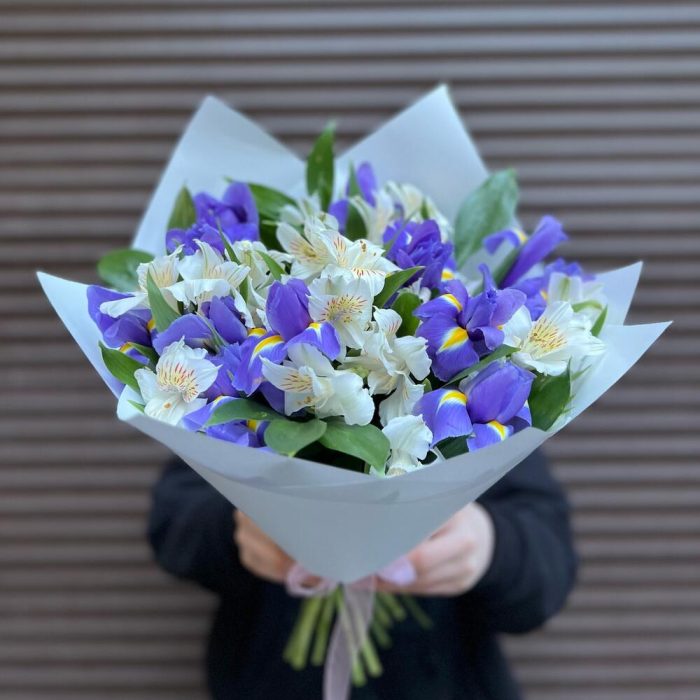 Альстромерия – 7 шт.Ирис – 12 шт.Корейская пленка – 2 шт.зелнень – 7 шт.