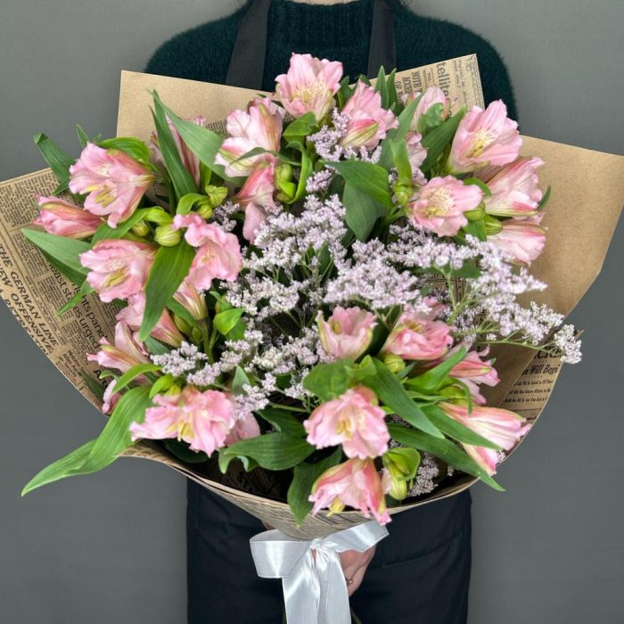 Альстромерия – 5 шт.Лимониум – 2 шт.Лента атласная – 1 шт.Упаковка дизайнерская – 1 шт.