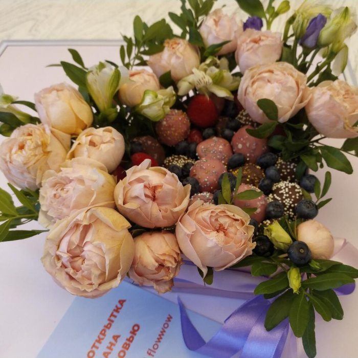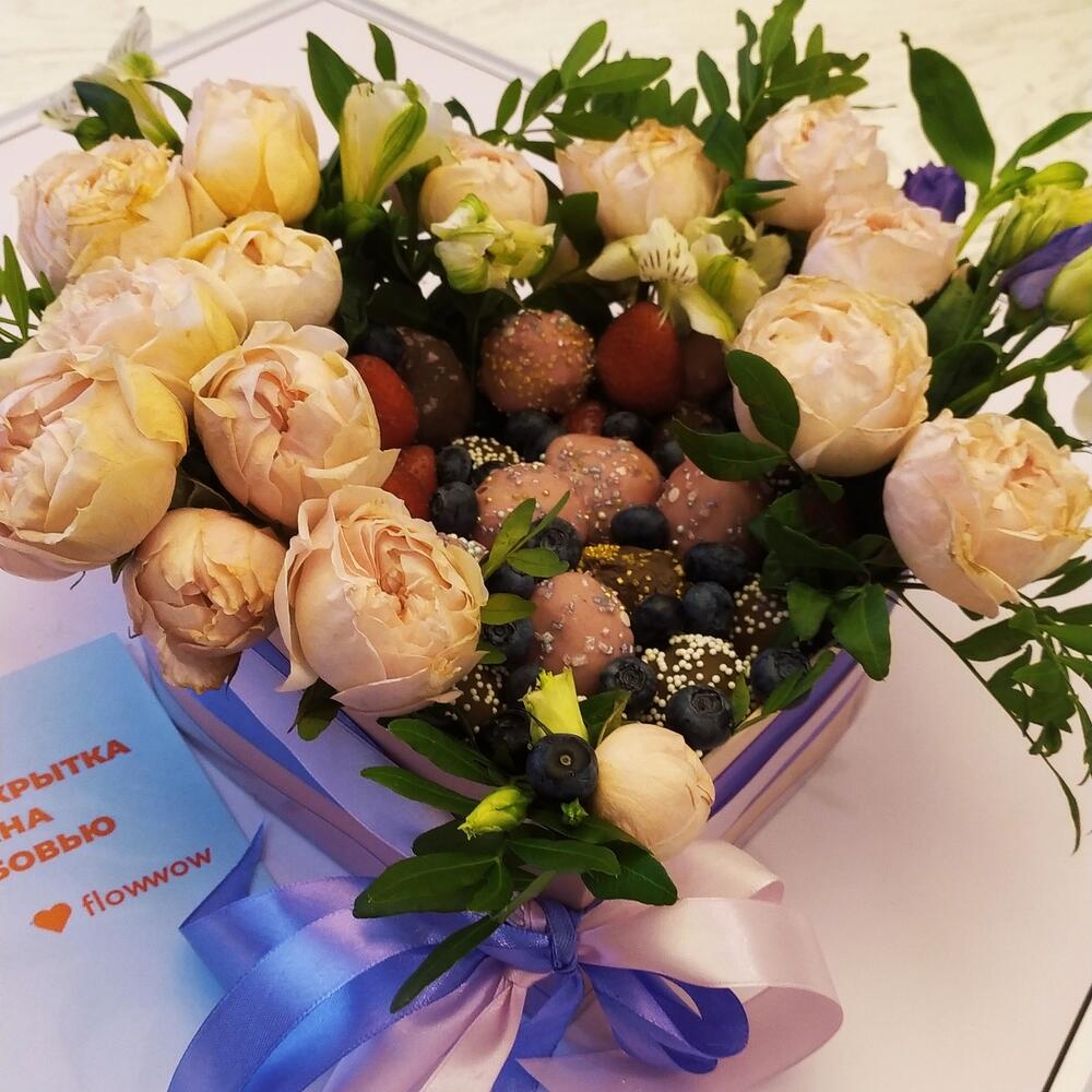 Альстромерия – 3 шт.Упаковка дизайнерская – 1 шт.Фисташка пучок – 1 шт.Коробка сердце большая – 1 шт.Голубика 100гр – 1 шт.Клубника в шоколаде callebaut (бельгия) – 25 шт.розы кустовые микс – 5 шт.