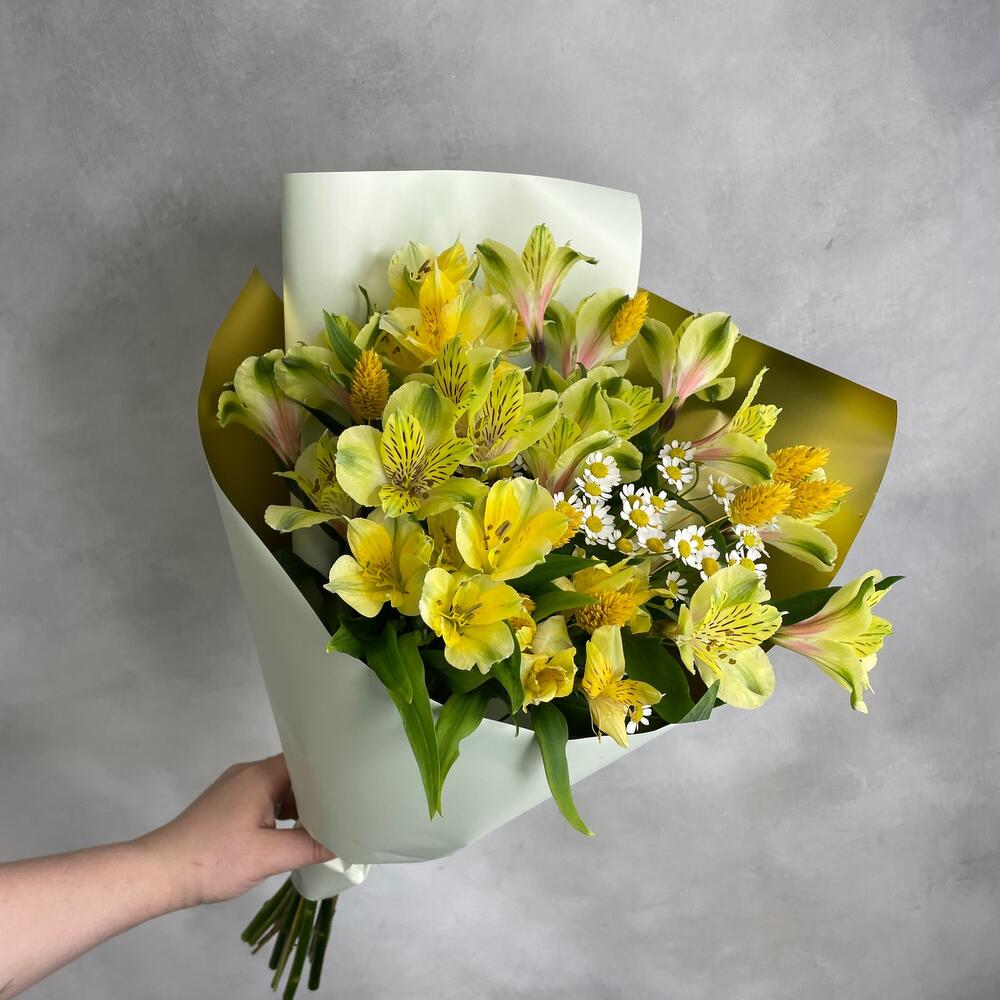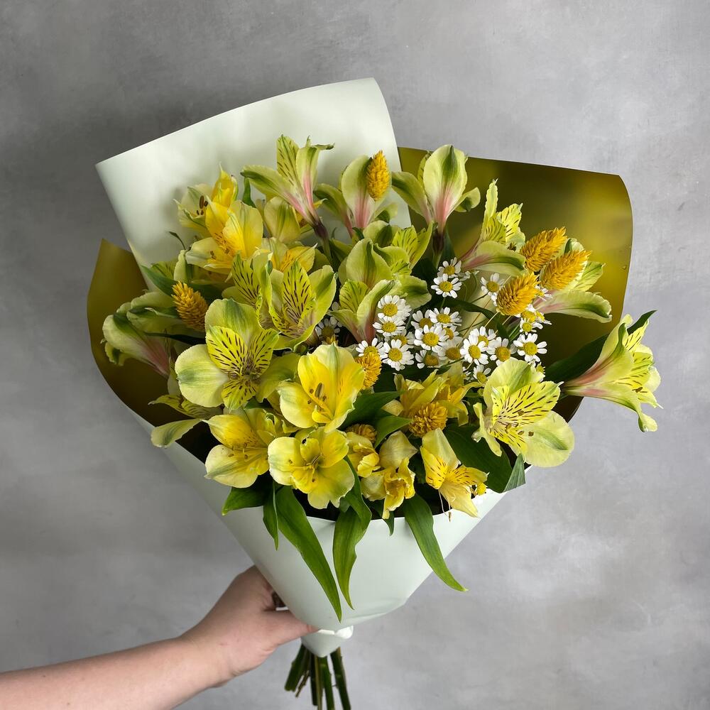 Альстромерия – 7 шт.Матрикария – 2 шт.Фаларис – 10 шт.Упаковка дизайнерская – 1 шт.