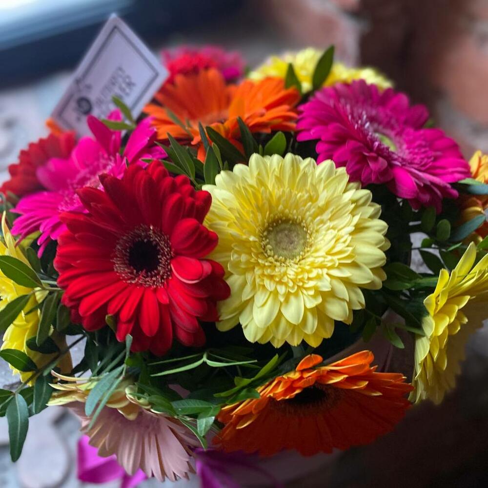 Букет из 17 разноцветных гербер и зелени в дизайнерской коробке “Салли”