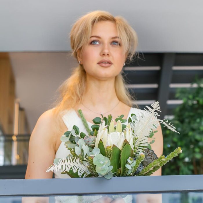 Протея королевская – 1 шт.Нелумбо – 2 шт.Эхеверия – 1 шт.Эвкалипт – 2 шт.амбрелла – 1 шт.Зелень – 5 шт.