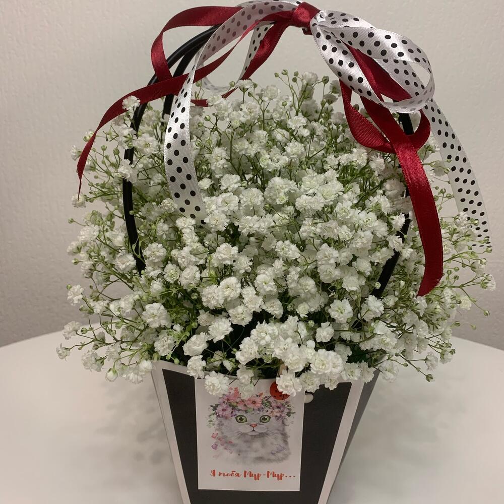 Гипсофила – 5 шт.Атласная лента – 2 шт.Оазис флористический – 1 шт.Сумочка с ручками из плотного картона ламинированого – 1 шт.