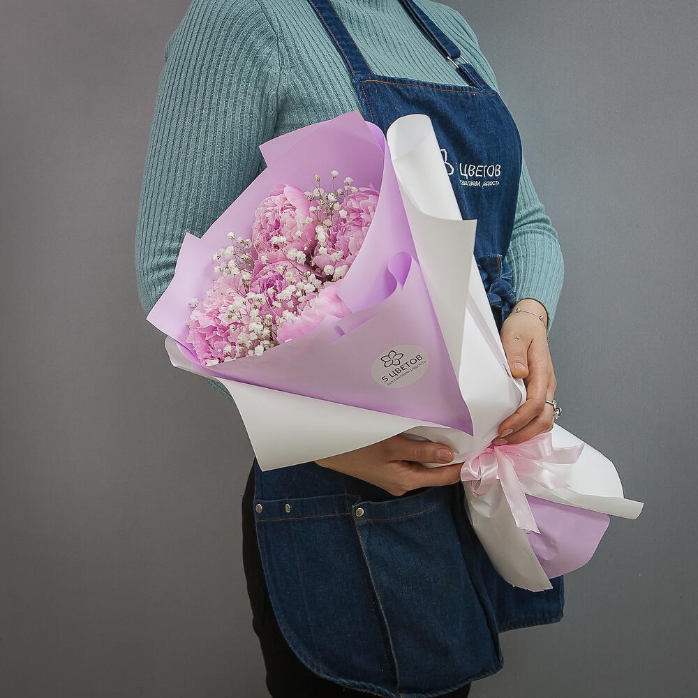 Гипсофила – 3 шт.Атласная лента – 1 шт.Упаковка матовая пленка – 1 шт.пионы розовые – 5 шт.