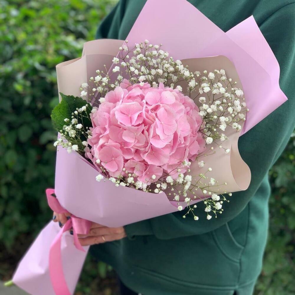 Гортензия – 1 шт.Гипсофила – 1 шт.Упаковка дизайнерская – 1 шт.Лента атласная – 1 шт.
