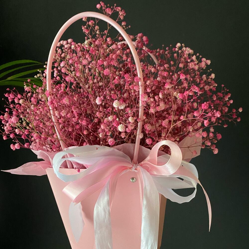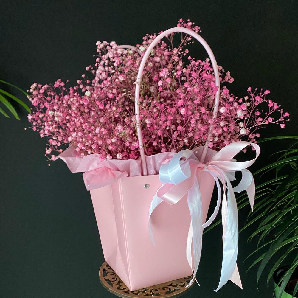 Гипсофила – 7 шт. Лента атласная – 3 шт. Тишью – 1 шт. Крафт пакет – 1 шт. Оазис флористический – 1 шт. Слюда упаковка – 3 шт.