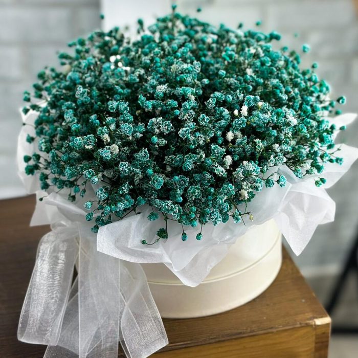 Гипсофила – 7 шт.Тишью – 3 шт.подкормка для срезанных цветов – 1 шт.инструкция по уходу за цветами – 1 шт.ленты атласные – 2 шт.шляпная коробка с лентами и оазисом – 1 шт.