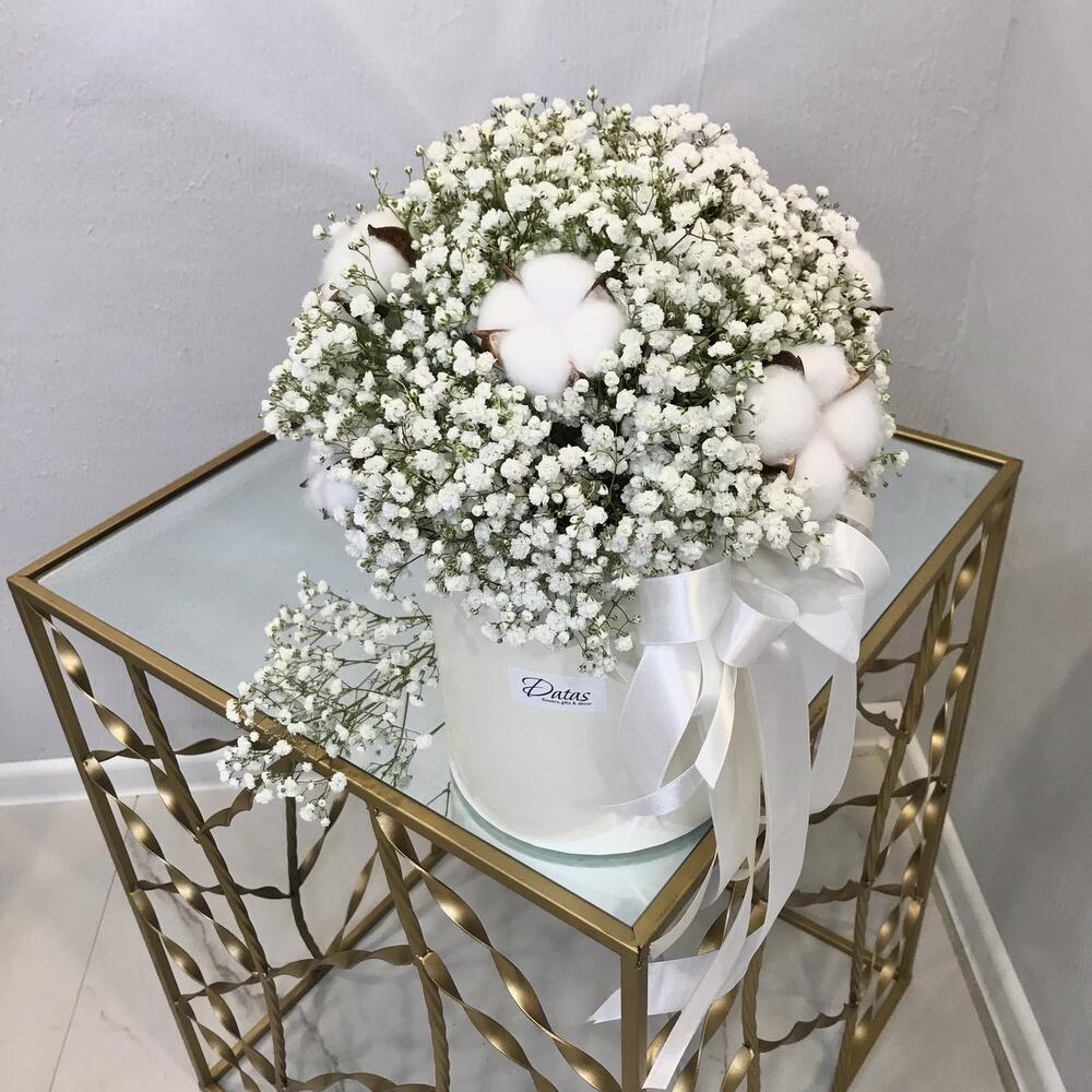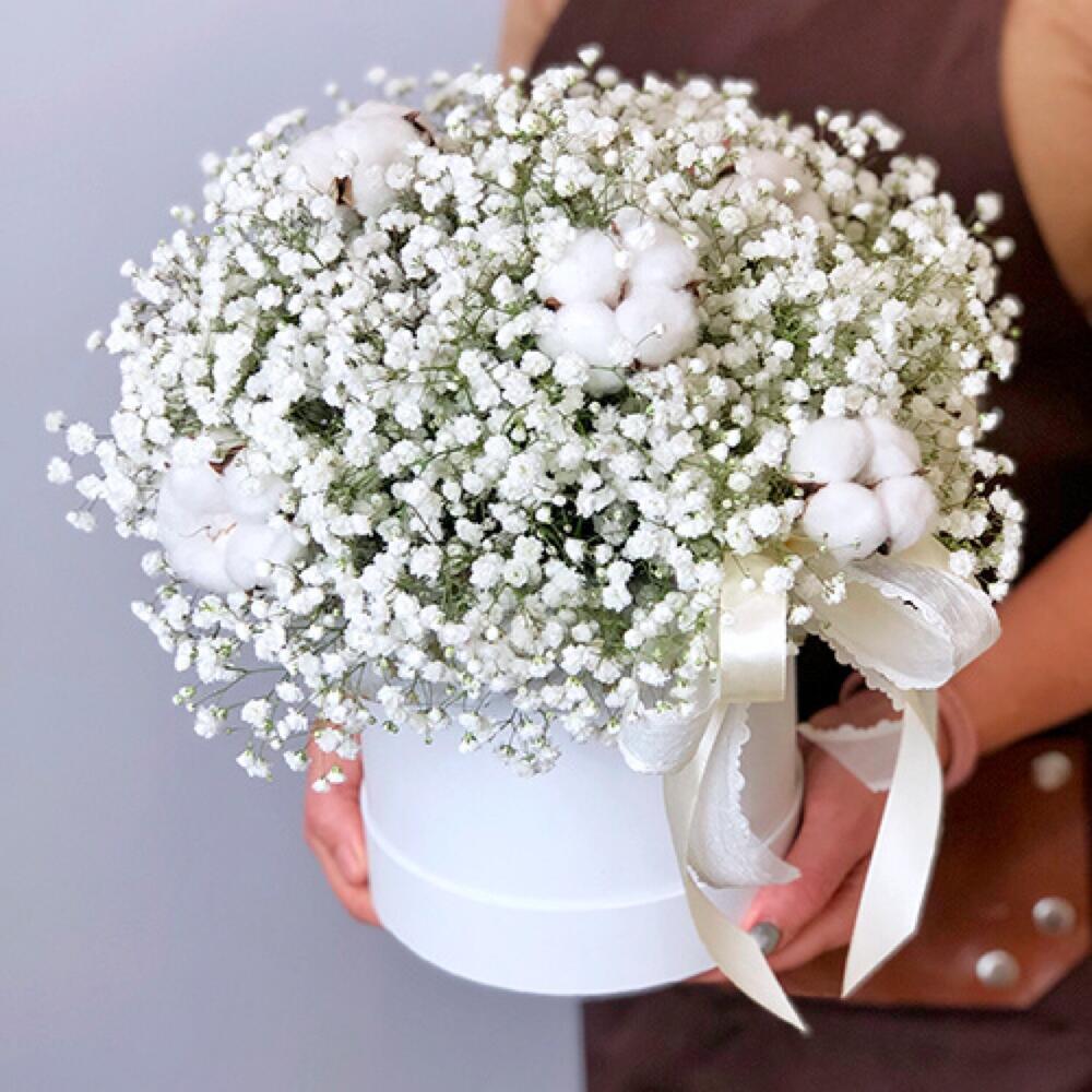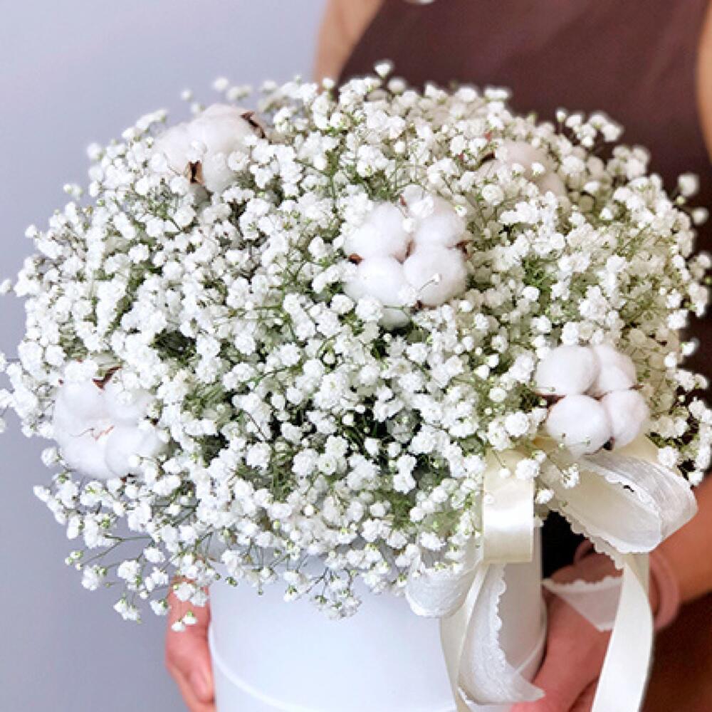 Гипсофила – 10 шт.Лента – 1 шт.Хлопок – 7 шт.биафлора – 1 шт.шляпная коробка d16 см – 1 шт.