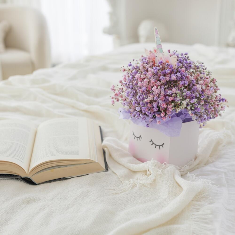 гипсофила цветная – 5 шт.коробка единорог – 1 шт.Тишью – 4 шт.Лента атласная – 1 шт.Оазис флористический – 1 шт.Упаковка транспортировочная пленка – 1 шт.