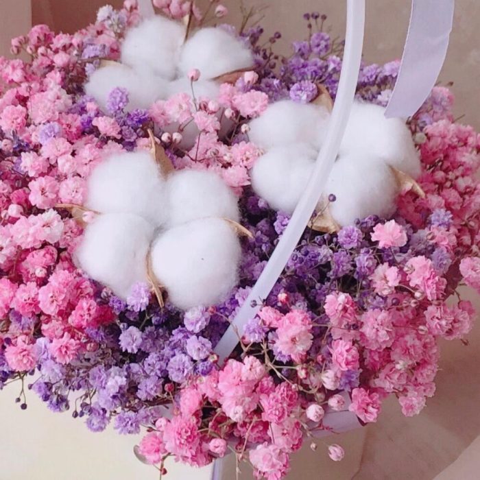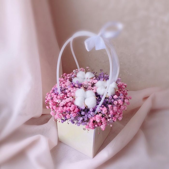 Хлопок – 3 шт.Лента атласная – 1 шт.Сумочка – 1 шт.Флористическая губка (оазис) – 1 шт.радужная гипсофила – 3 шт.