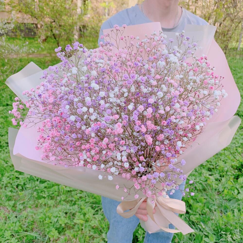 Лента атласная – 1 шт.Дизайнерская упаковка – 1 шт.инструкция по уходу за цветами – 1 шт.гипсофила радужная – 5 шт.любовь флориста (бесплатно) – 1 шт.витамины для цветов – 1 шт.