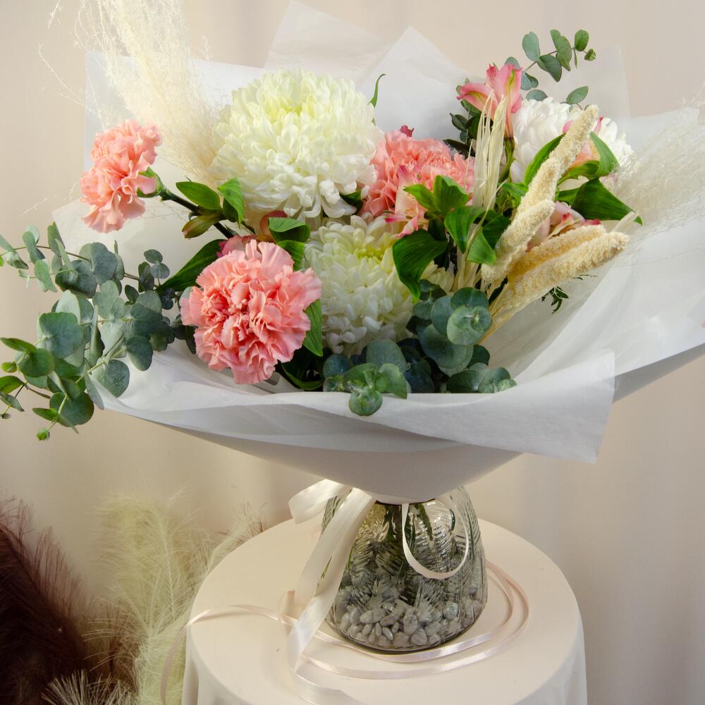 Гвоздики, Лизиантусы, Розы, Тюльпаны