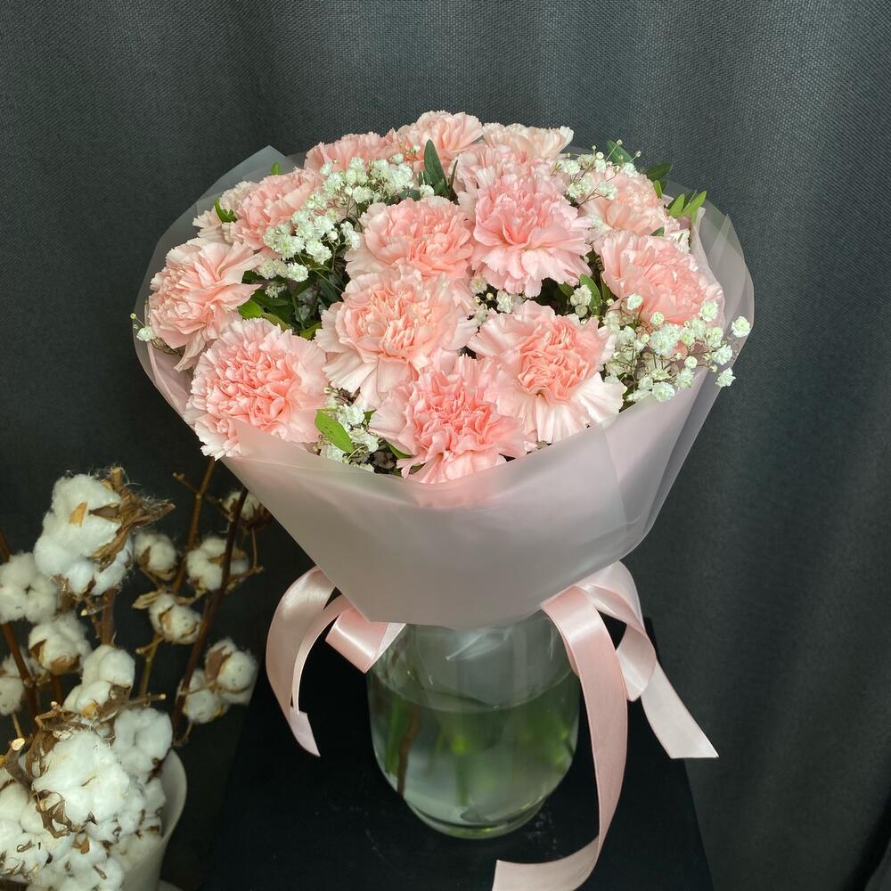 Гипсофила – 3 шт.Лента атласная – 1 шт.Диантус – 15 шт.Фисташка – 2 шт.Дизайнерская упаковка – 1 шт.