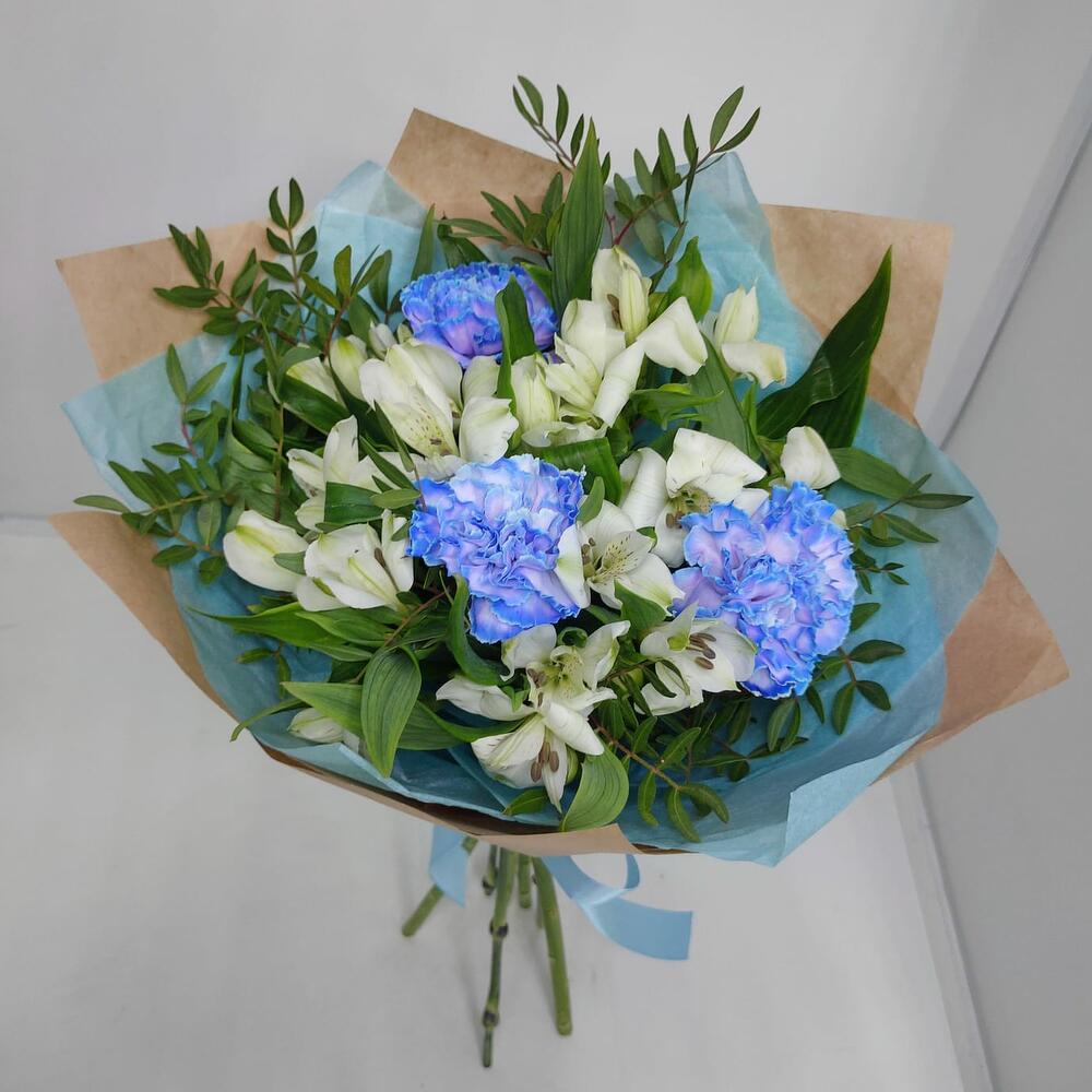 Альстромерия – 4 шт.Дизайнерская упаковка – 1 шт.зелень фисташки – 1 шт.диантусы голубые – 3 шт.