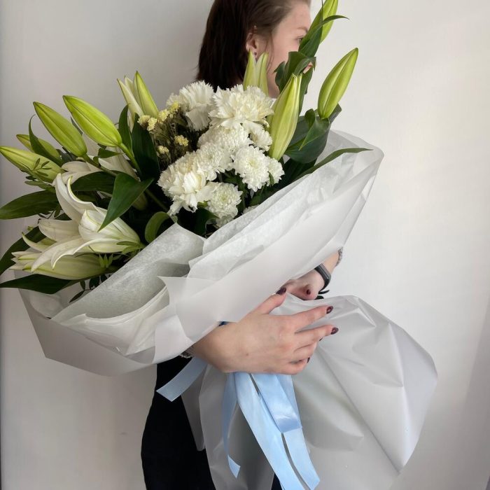 Лилия – 3 шт.Статица – 1 шт.Лента атласная – 2 шт.Диантус – 3 шт.Сантини – 1 шт.Фисташка – 5 шт.Пленка матовая – 6 шт.