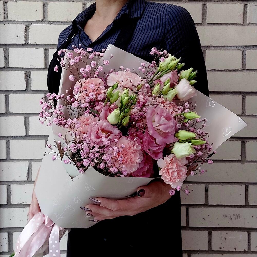 Лизиантус розовый – 3 шт.гипсофила радужная – 2 шт.Диантус – 9 шт.Упаковка дизайнерская – 3 шт.Лента атласная – 1 шт.