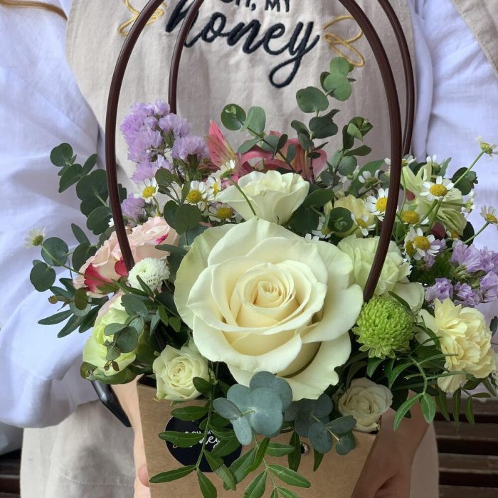Сумочка с цветами – отличный способ выразить благодарность педагогу или врачу.Цветы внутри сумочки находятся в флористической губке, которую можно поливать, за счет чего они ещё долго сохранят свежесть и будут радовать получателя.