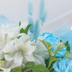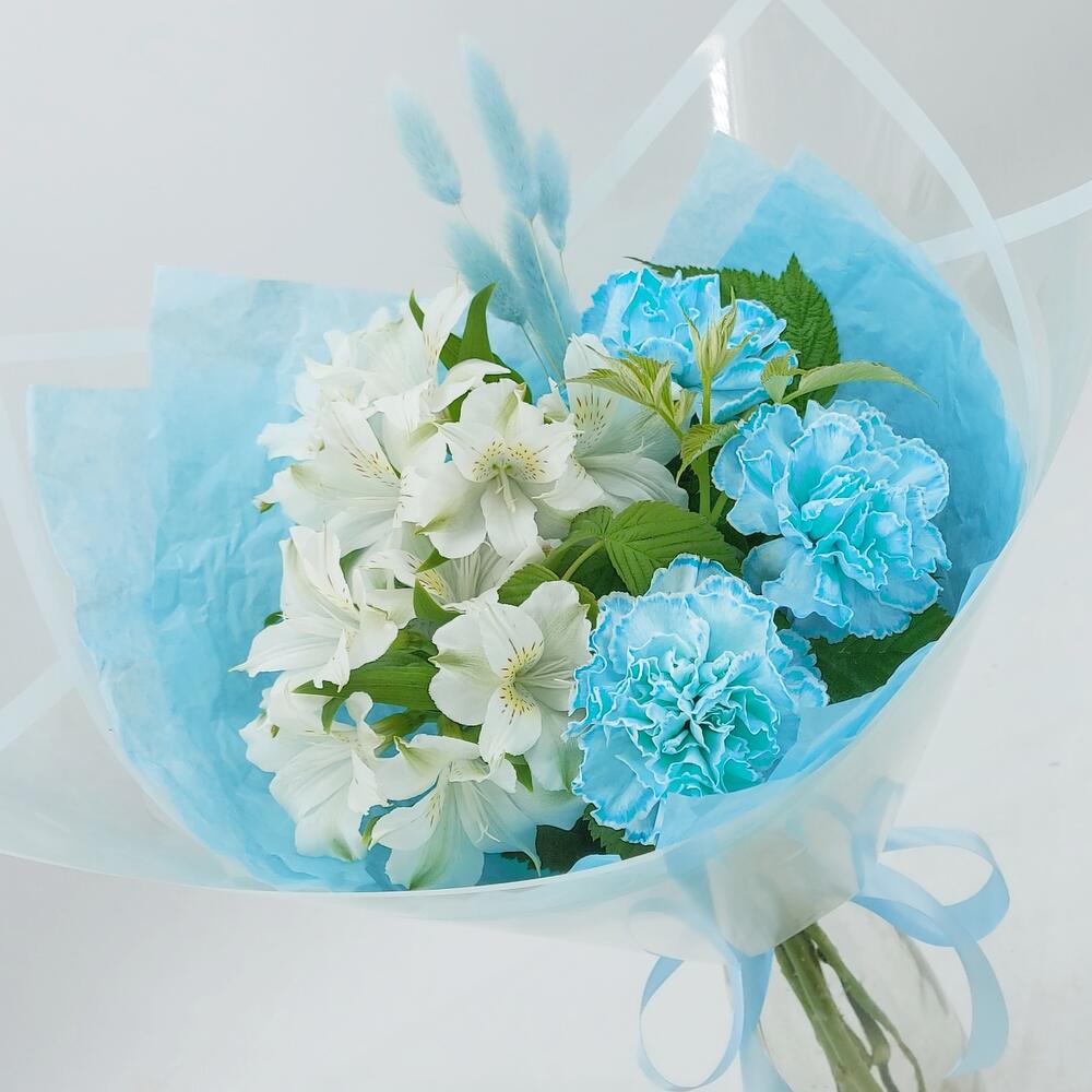 Упаковка дизайнерская – 1 шт.Лагурус – 5 шт.Средство для продления жизни цветов – 1 шт.рускус зелень ветка – 2 шт.альстромерия премиум – 2 шт.гвоздика молли голубая – 3 шт.