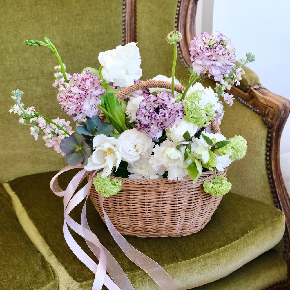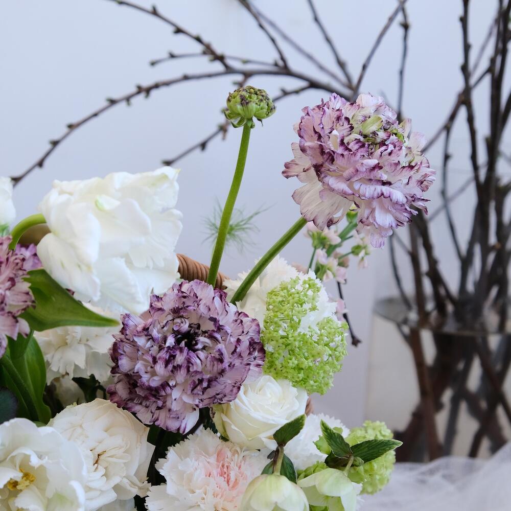 Гвоздика – 6 шт.Корзина плетеная – 1 шт.вибурнум Розеум (Калина зеленая) – 1 шт.Лизиантус Алиса белый – 1 шт.Оазис флористический – 1 шт.Хелеборус (морозник) – 1 шт.Мох стабилизированный – 1 шт.Тюльпан попугайчик – 2 шт.маттиола сиреневая – 3 шт.ранункулюс пон пон – 4 шт.