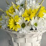 Корзина ротанговая – 1 шт.Оазис – 3 шт.Хризантема Кустовая Бакарди белая – 7 шт.хризантема кустовая селебрейт – 8 шт.Пшеница (сухоцвет) – 20 шт.