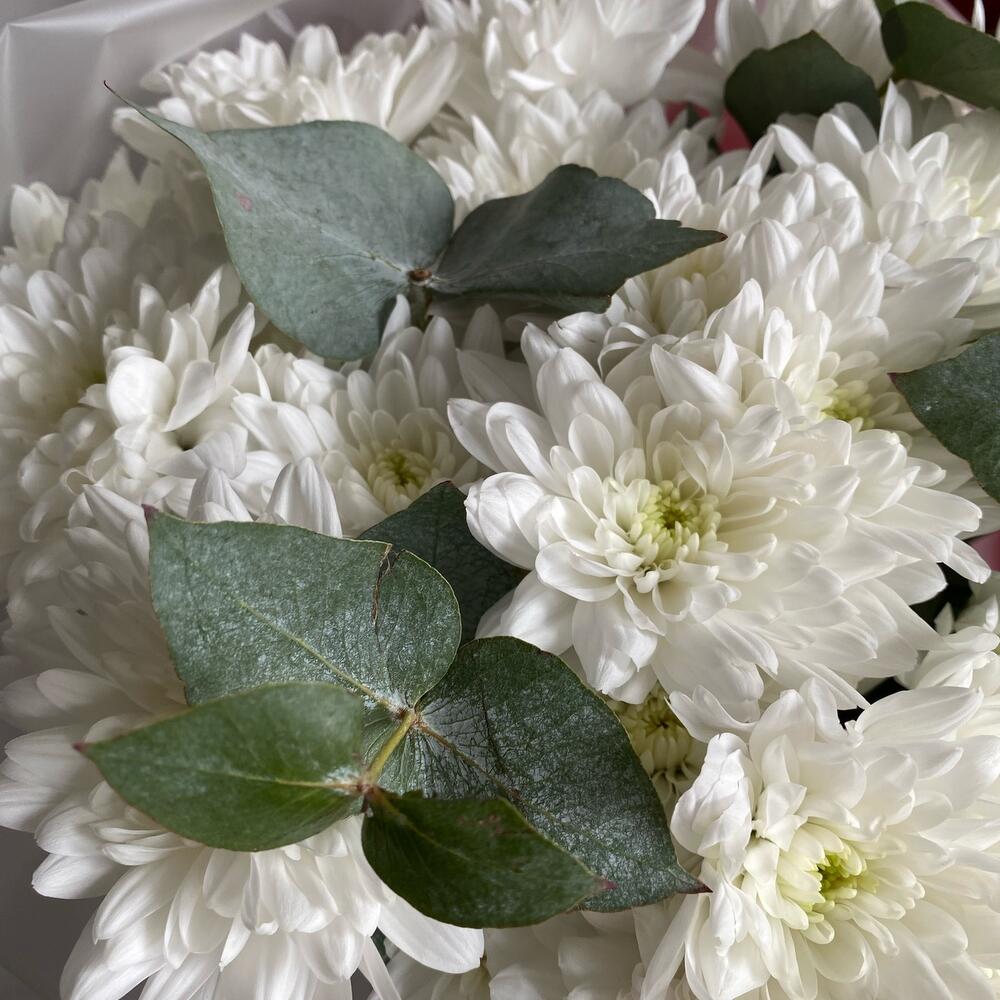 Лента атласная – 1 шт.Хризантема кустовая белая – 7 шт.Упаковка дизайнерская – 1 шт.Аквапак – 1 шт.Транспортировочная коробка – 1 шт.эвкалипт cineria пучок – 1 шт.