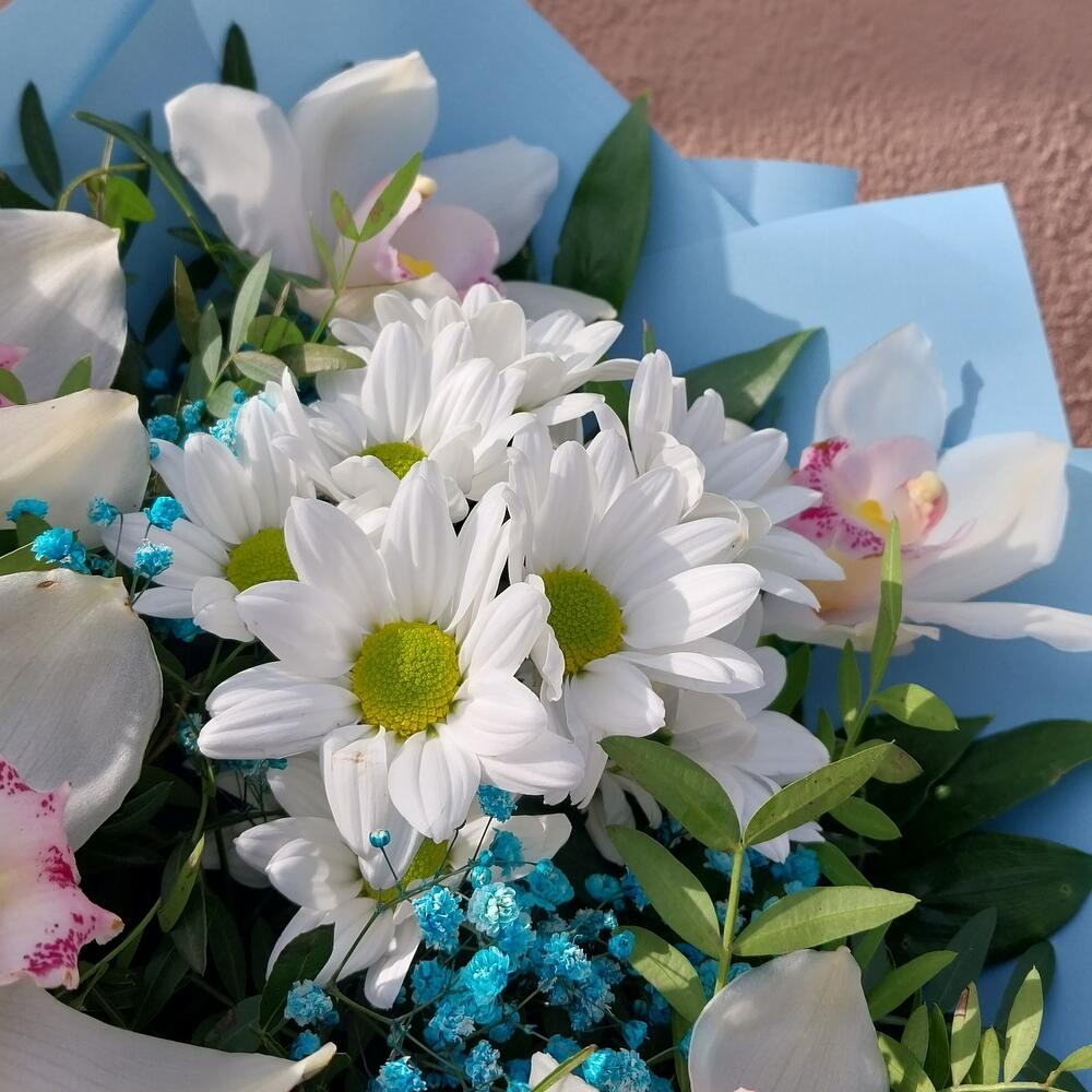 бакарди ромашка хризантема кустовая – 1 шт.Орхидея Цимбидиум – 5 шт.гипсофила радужная – 1 шт.Фисташка – 8 шт.Упаковка дизайнерская – 3 шт.