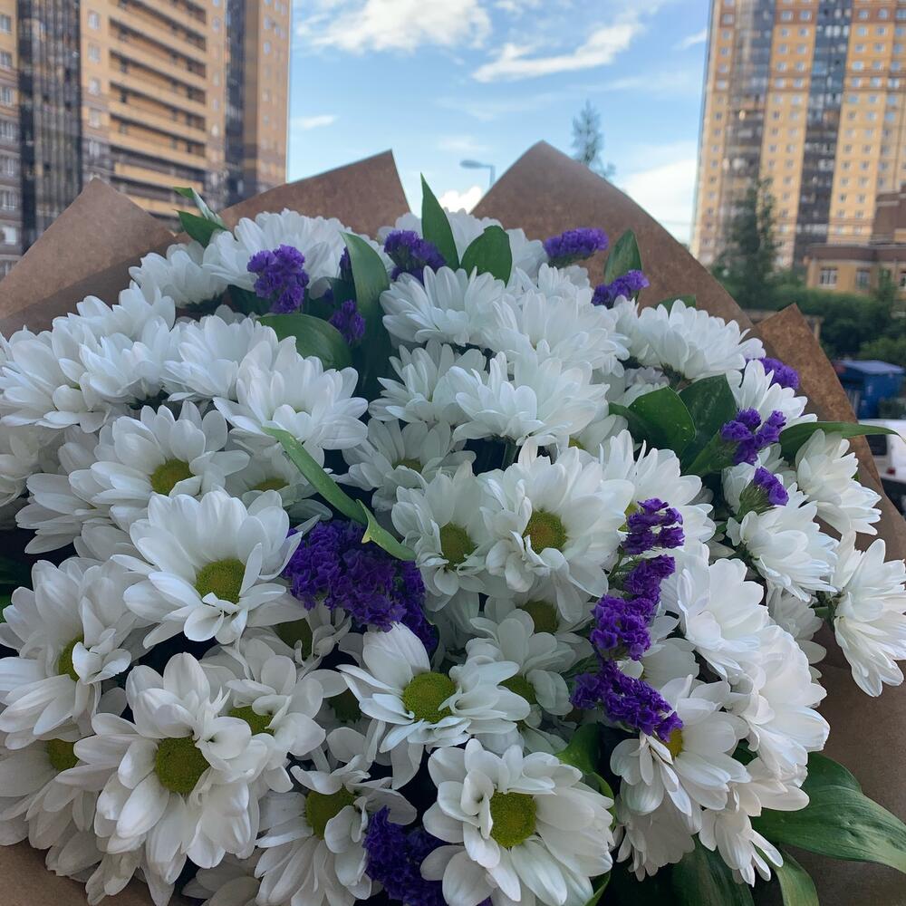Рускус – 10 шт.Упаковка дизайнерская – 1 шт.Статица синяя – 3 шт.Ромашковая хризантема – 11 шт.