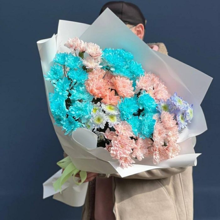 Шикарный яркий букет из радужной хризантемы станет отличным подарком для ваших родных и близких и долго будет радовать своими красками
