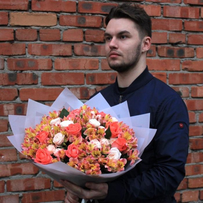 Альстромерия – 20 шт.Рускус – 7 шт.Лента атласная – 1 шт.Роза кустовая пионовидная – 5 шт.упаковочный материал – 3 шт.роза жиардина – 10 шт.