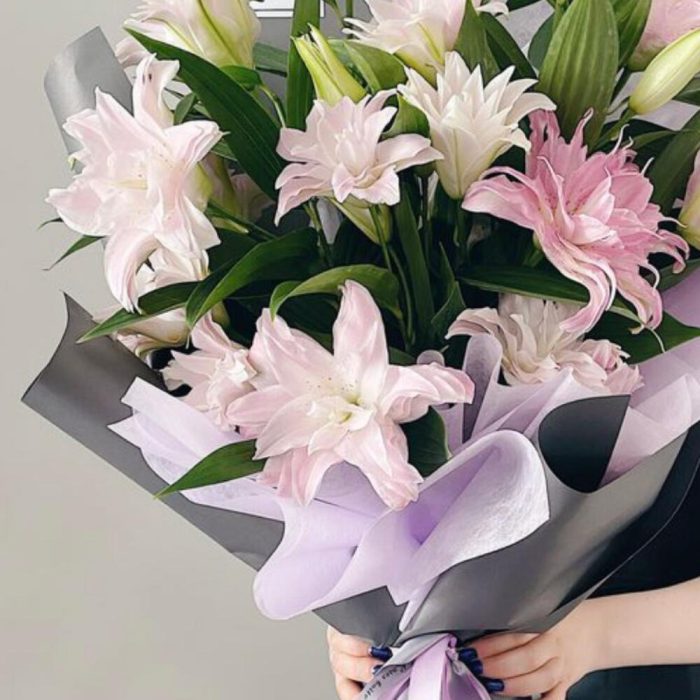 Лента атласная – 2 шт.Упаковка дизайнерская – 3 шт.лилия махровая премиум – 7 шт.