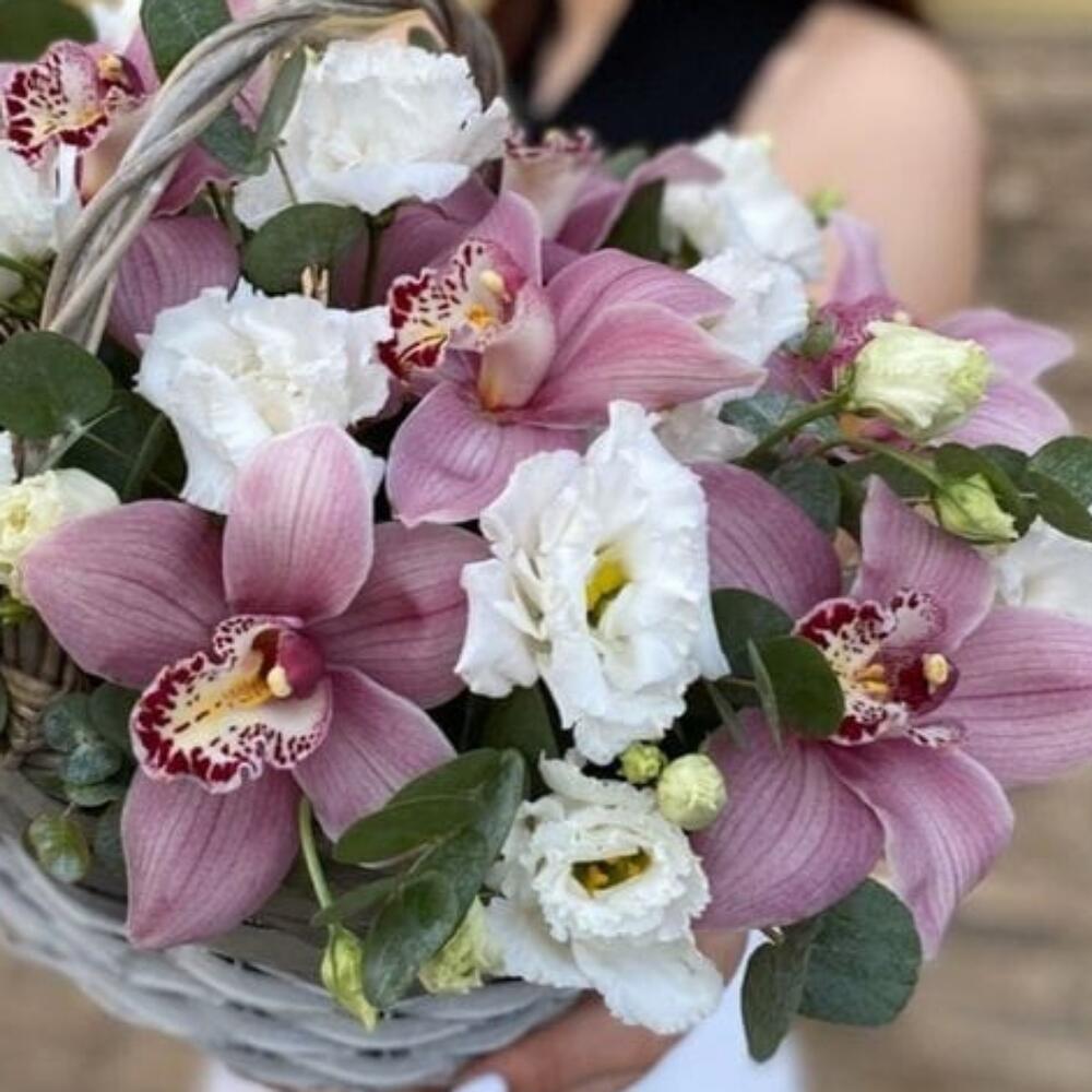 Цимбидиум белый – 9 шт.Лизиантус – 7 шт.Эвкалипт пучок – 1 шт.Фисташка – 1 шт.Корзина плетеная – 1 шт.Оазис флористический – 2 шт.