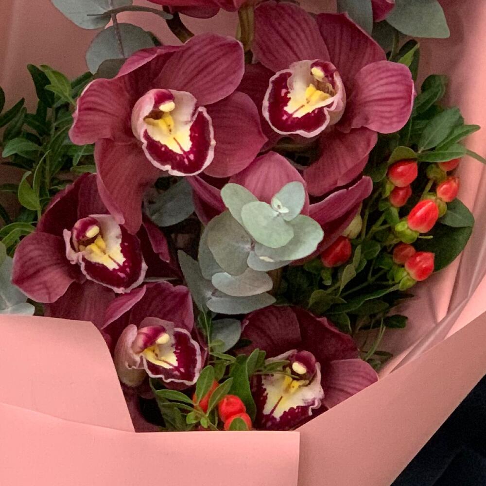 орхидея – 1 шт.Эвкалипт – 1 шт.Зелень – 2 шт.Гиперикум – 1 шт.Дизайнерская упаковка – 1 шт.
