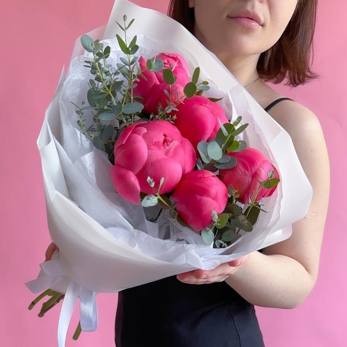 Коралл шарм пионы – 5 шт.Эвкалипт – 2 шт.Упаковка дизайнерская – 1 шт.