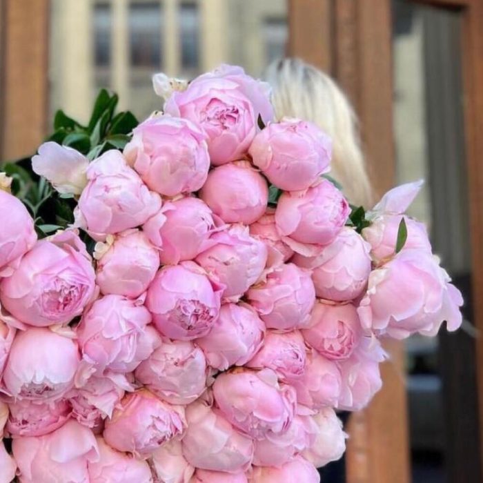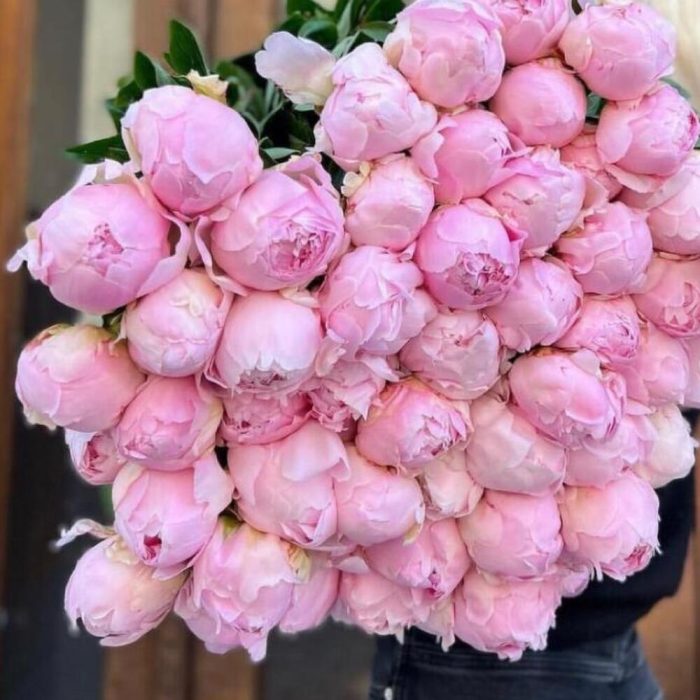 Пион розовый – 51 шт.Лента атласная – 2 шт.Открыточка с вашими пожеланиями – 1 шт.хорошее настроение – 100 шт.инструкция по уходу за цветами – 1 шт.коробка переноска – 1 шт.Кризал – 1 шт.