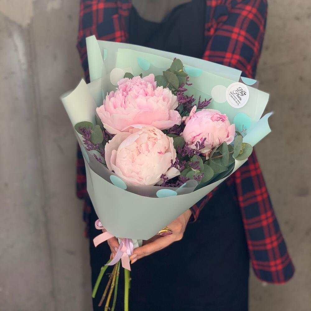 Пион Сара Бернар – 3 шт.зелень декоративная – 3 шт.Лимониум – 2 шт.Упаковка дизайнерская – 1 шт.