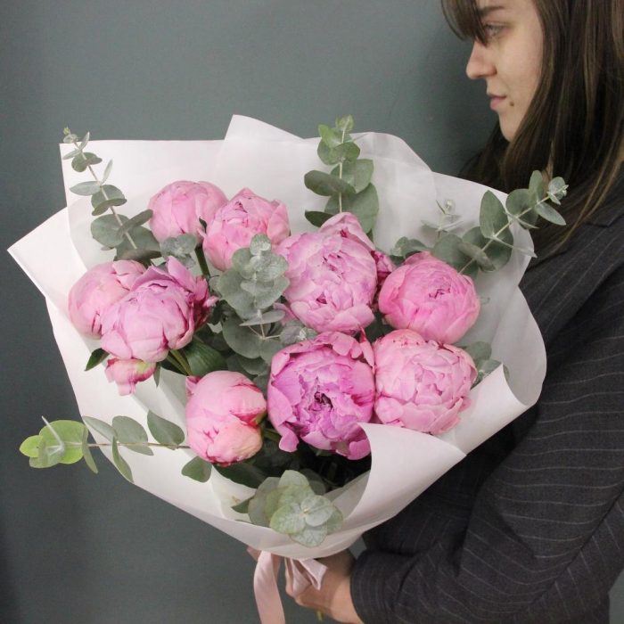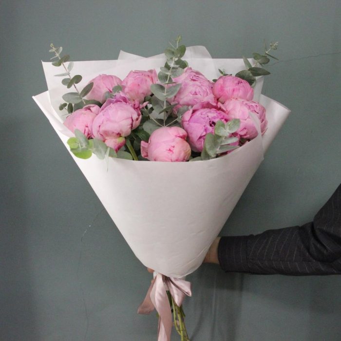 Пион – 9 шт.Эвкалипт – 7 шт.Лента атласная – 2 шт.Бумага – 3 шт.