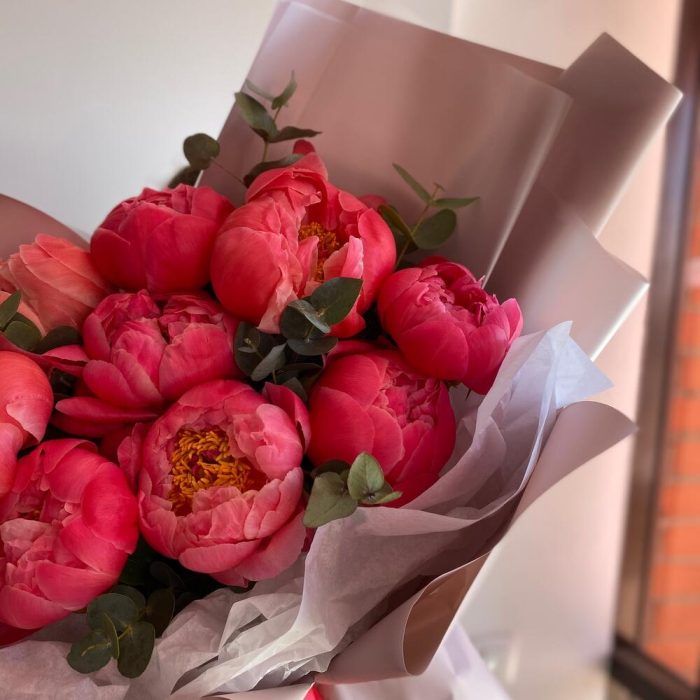 пионы Коралл шарм – 9 шт.Эвкалипт – 6 шт.Пленка дизайнерская – 5 шт.Лента атласная – 2 шт.Тишью белое – 2 шт.инструкция по уходу за цветами – 1 шт.Кризал (подкормка) – 1 шт.