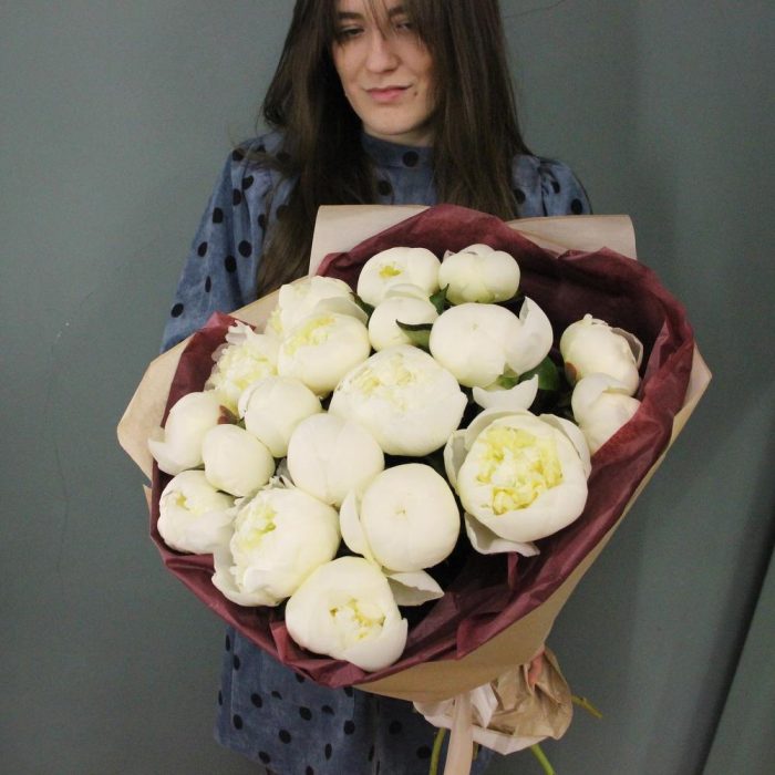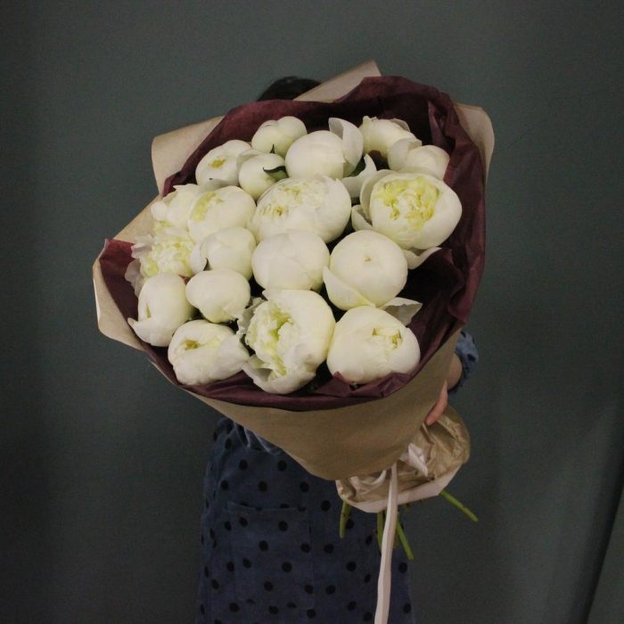 Моно букет из 19 белых пионов, в лаконичной упаковке.