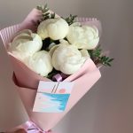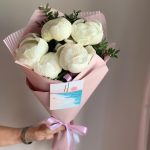 Пион – 5 шт.Зелень – 3 шт.Лента атласная – 2 шт.Упаковка дизайнерская – 3 шт.