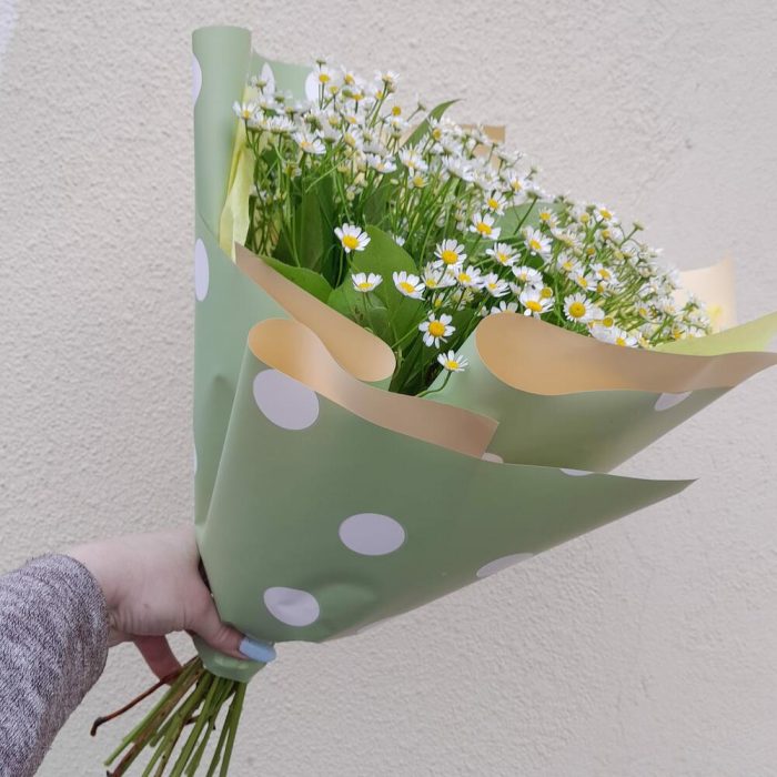 Салал – 5 шт.Лента атласная – 2 шт.Упаковка дизайнерская – 3 шт.матрикария (полевая ромашка) – 15 шт.