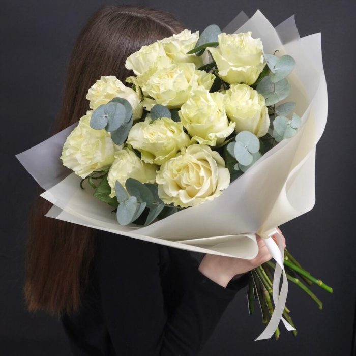 11 белых роз Moonstone с веточками эвкалипта
