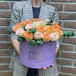 Роза одноголовая – 25 шт.Коробка шляпная – 1 шт.Эвкалипт Микс – 3 шт.Оазис флористический – 2 шт.