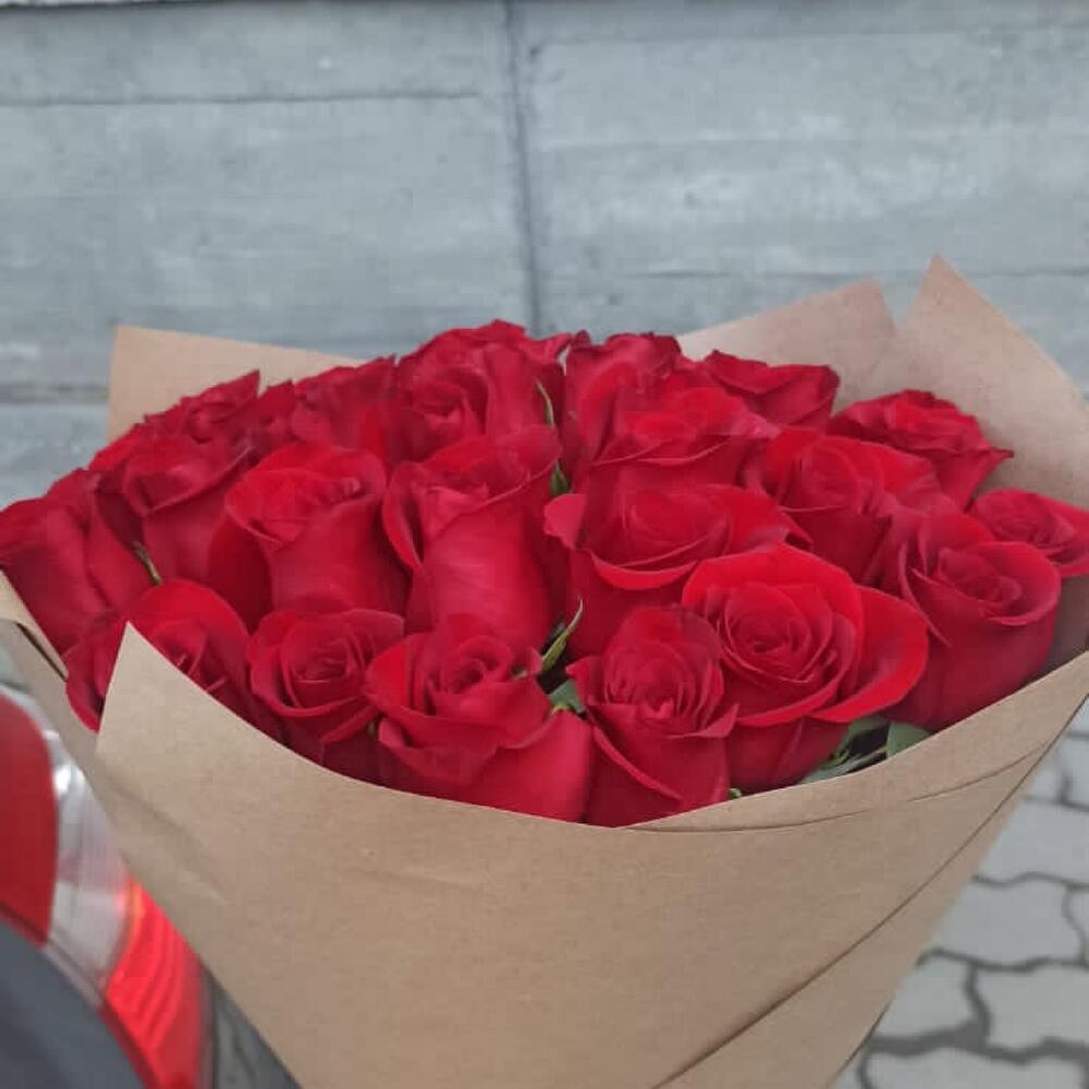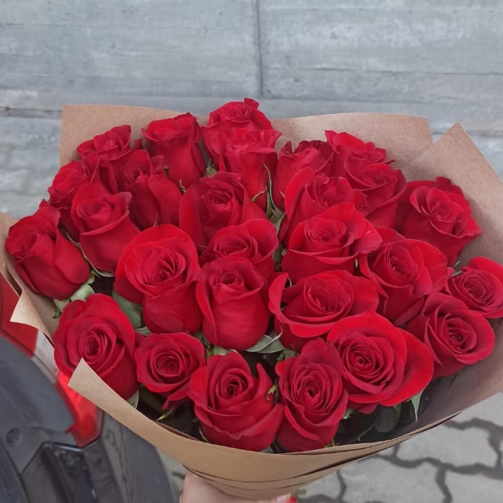 розы эквадор 70 см – 27 шт.Крафт дизайнерский – 2 шт.Лента атласная – 1 шт.
