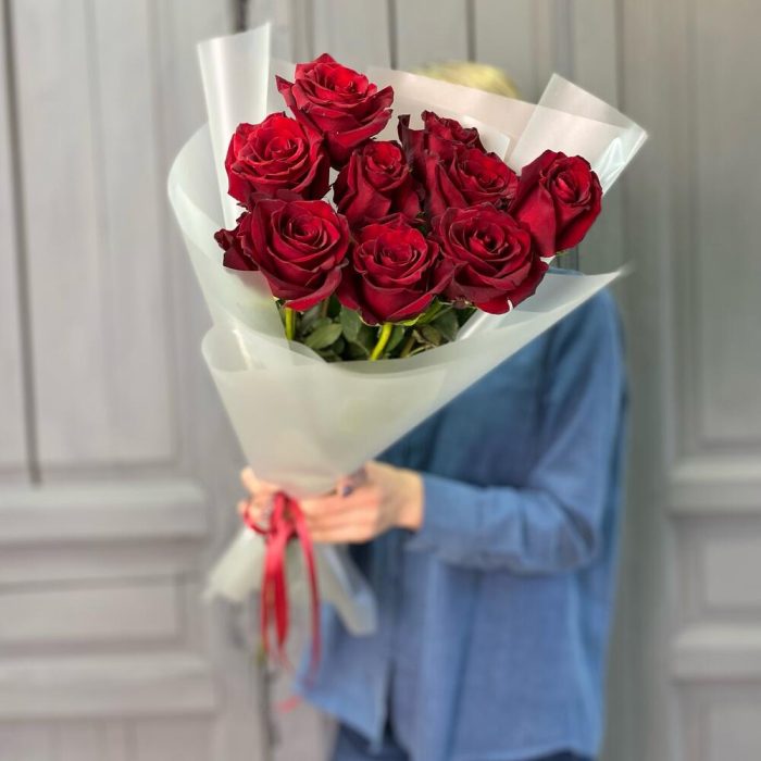 Роза красная Эквадор – 9 шт.Упаковка дизайнерская – 2 шт.Лента атласная – 2 шт.