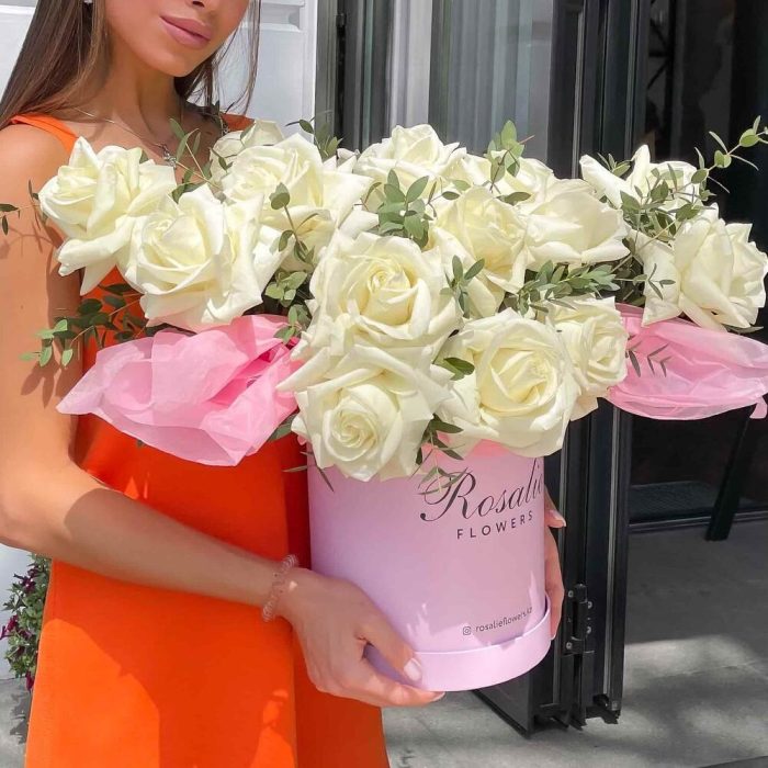 Роза 40 см – 21 шт. Эвкалипт – 1 шт. коробка фирменная – 1 шт.