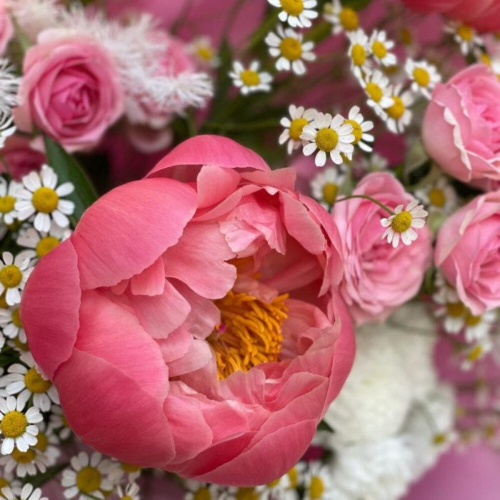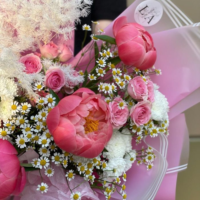 Пион – 3 шт.Хризантема кустовая – 3 шт.Кустовая роза – 2 шт.Лента атласная – 1 шт.Тишью – 1 шт.Ромашка кустовая – 5 шт.Упаковка дизайнерская – 4 шт.Аспарагус Умбелатус – 1 шт.