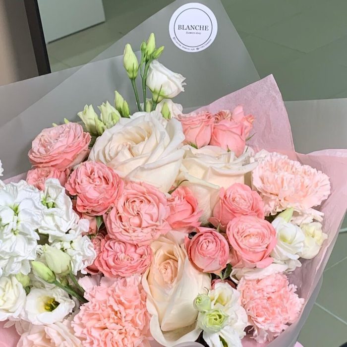 Лизиантус белый – 3 шт.Фирменная упаковка – 1 шт.Маттиола белая – 3 шт.Диантус розовый – 3 шт.кустовая роза madam bombastic – 3 шт.пионовидная роза white o’hara – 5 шт.