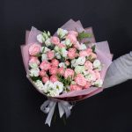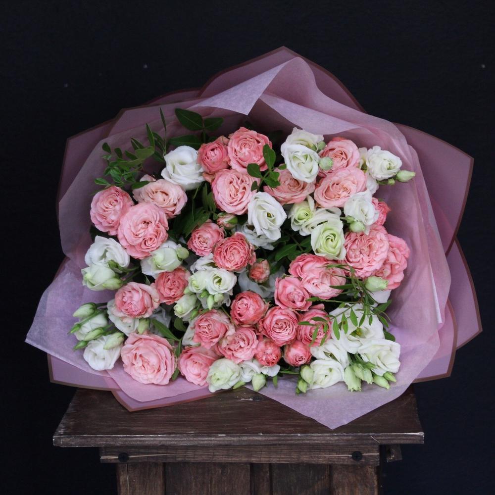 Эустома – 7 шт.Роза кустовая пионовидная мадам бомбастик – 10 шт.Фисташка – 2 шт.Тишью – 2 шт.Пленка дизайнерская – 2 шт.Лента атласная – 2 шт.