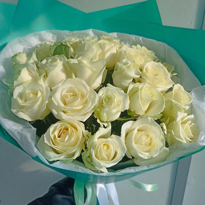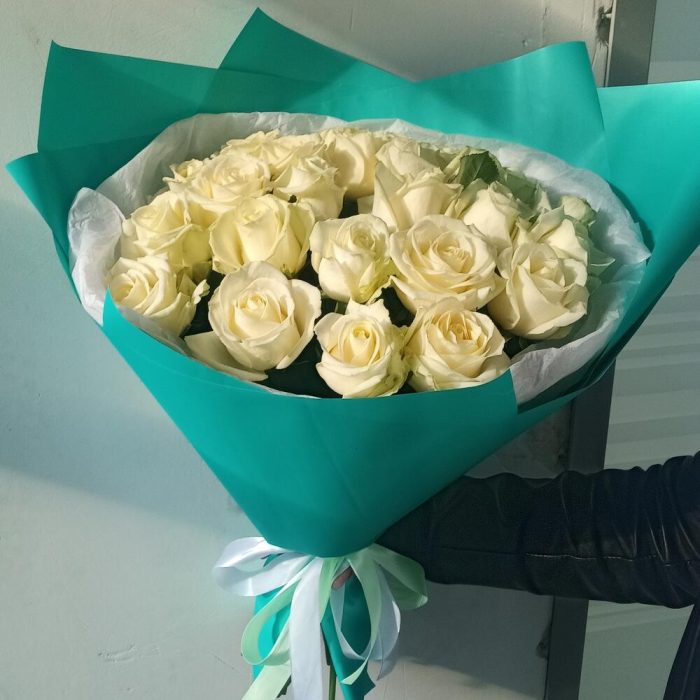 Тишью – 3 шт.Упаковка дизайнерская – 4 шт.роза россия белая 60 см – 25 шт.